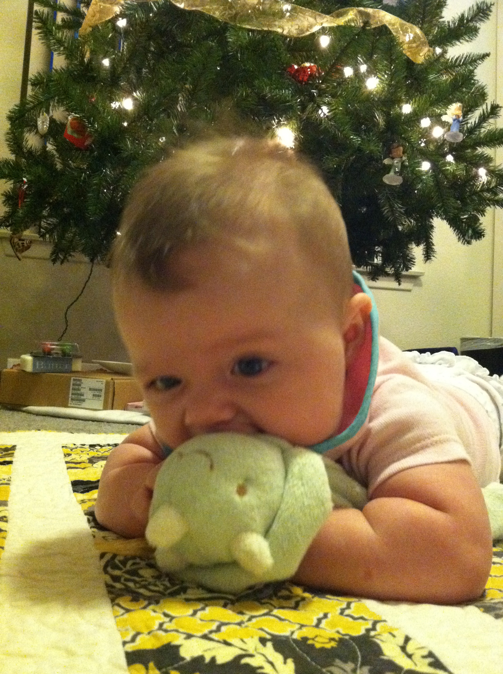 • Liesl started rolling over about a month ago, and she loves being able to move around.