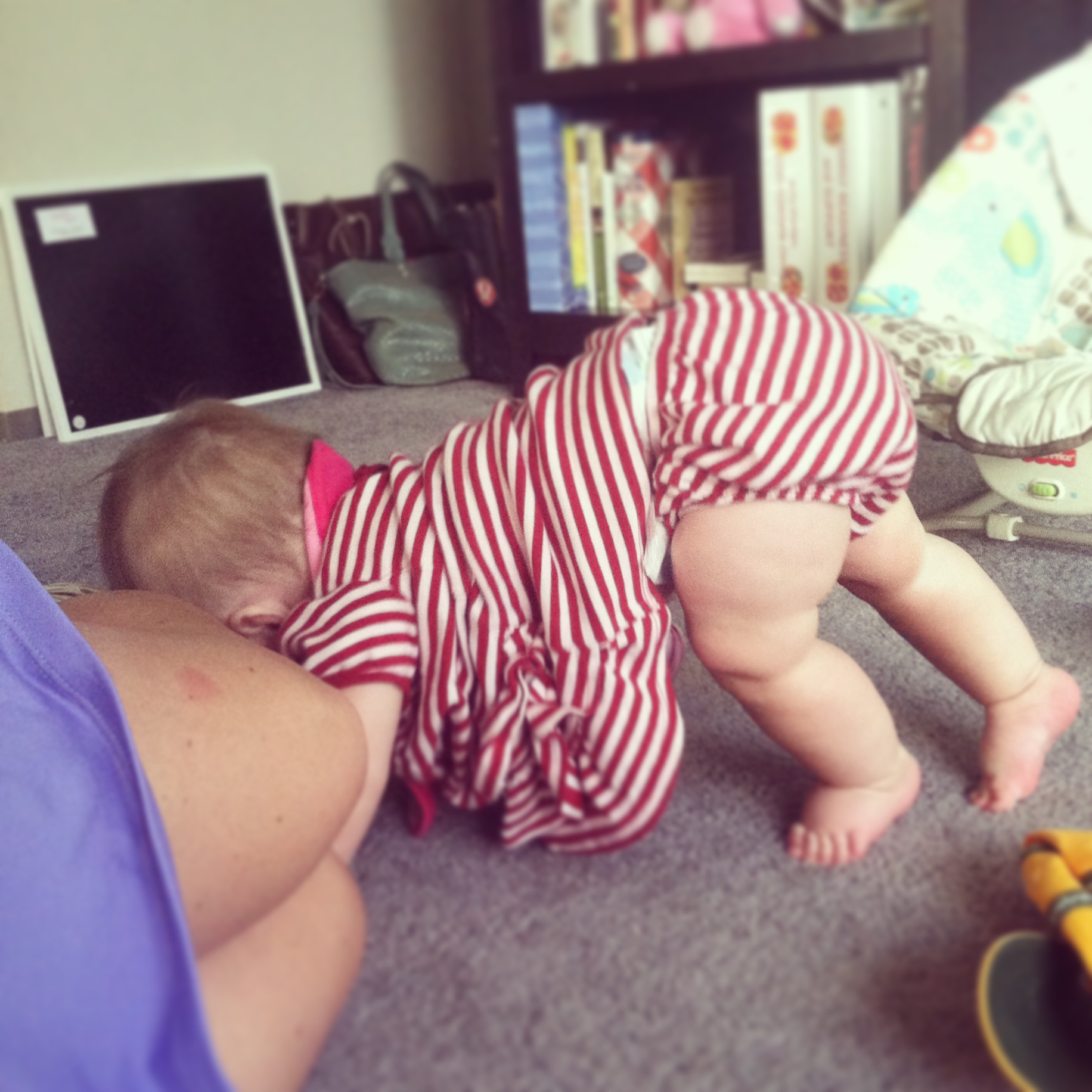 Everything goes into her mouth, and she soaks about four bibs a day. She’s learning how to put food, like baby snacks, into her mouth and gumming them down. Our daily walks in her stroller continue to be a highlight for her, as is her bath time at night with her daddy. (As you can see, baths are a contact sport in our house.)