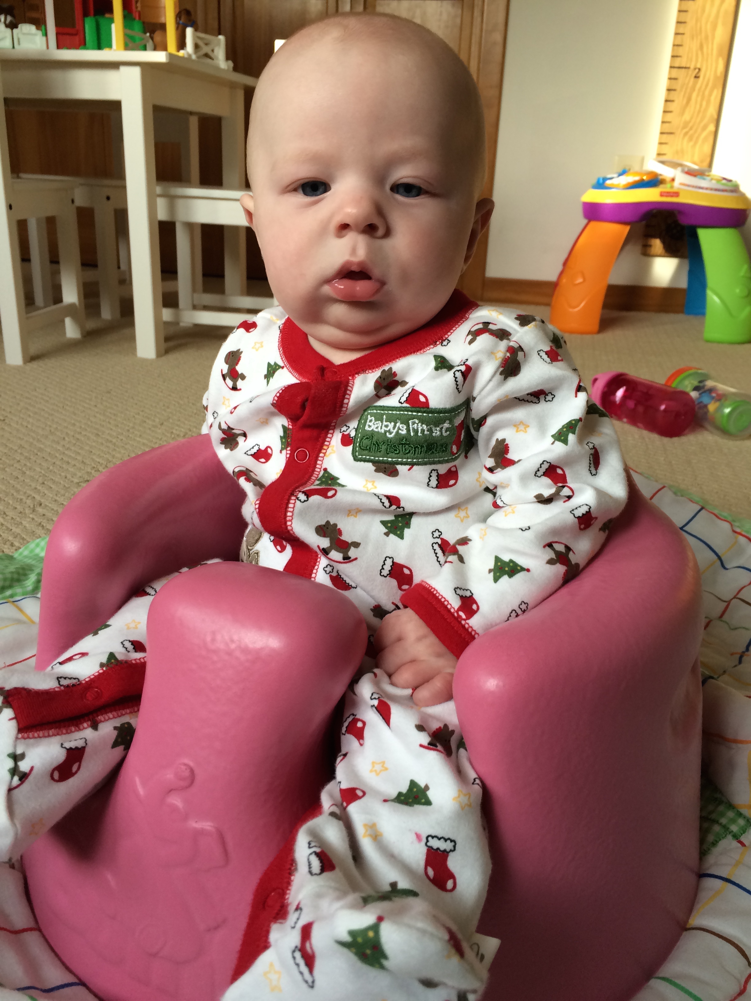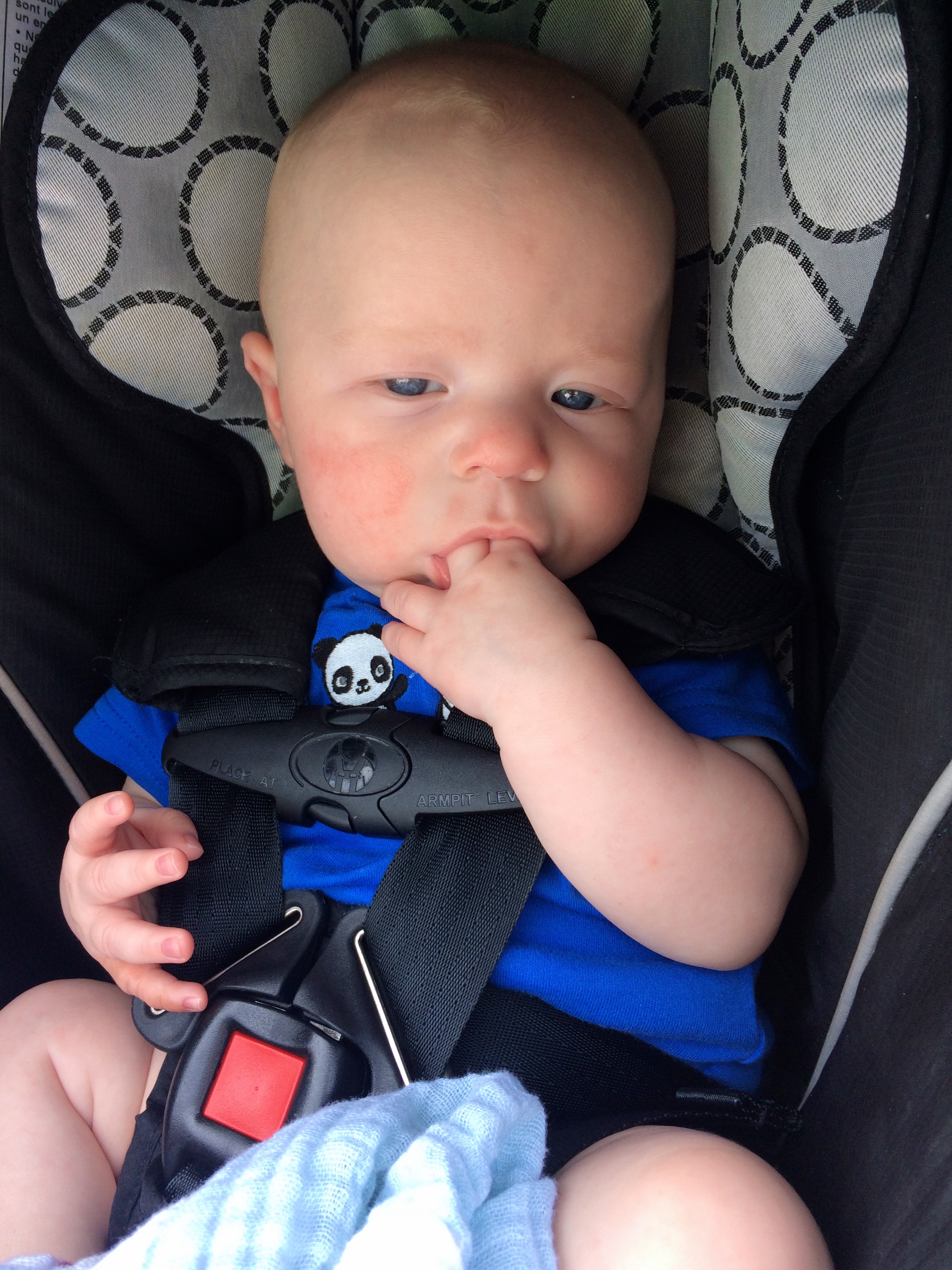 - Rolling over and scooting. He started rolling over front-to-back and back-to-front ridiculously early at eight weeks old. This shocked both Pete and me, and I had to go back through these posts to remember how old Liesl was when she started doing this. (I think she was about 4-5 months old.) August is a really strong little guy!